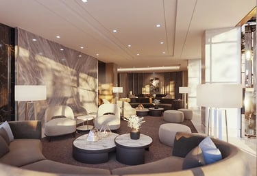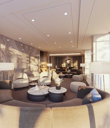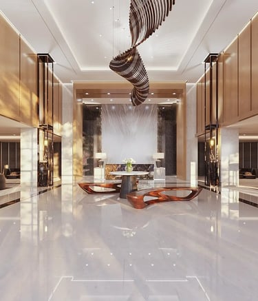 The expansive lobby is decorated with fixtures and furniture mimicking the soothing motion of waves. Spacious and charming. The lobby is a wonderful place to come greet visitors. spend time in, or simply pass by.